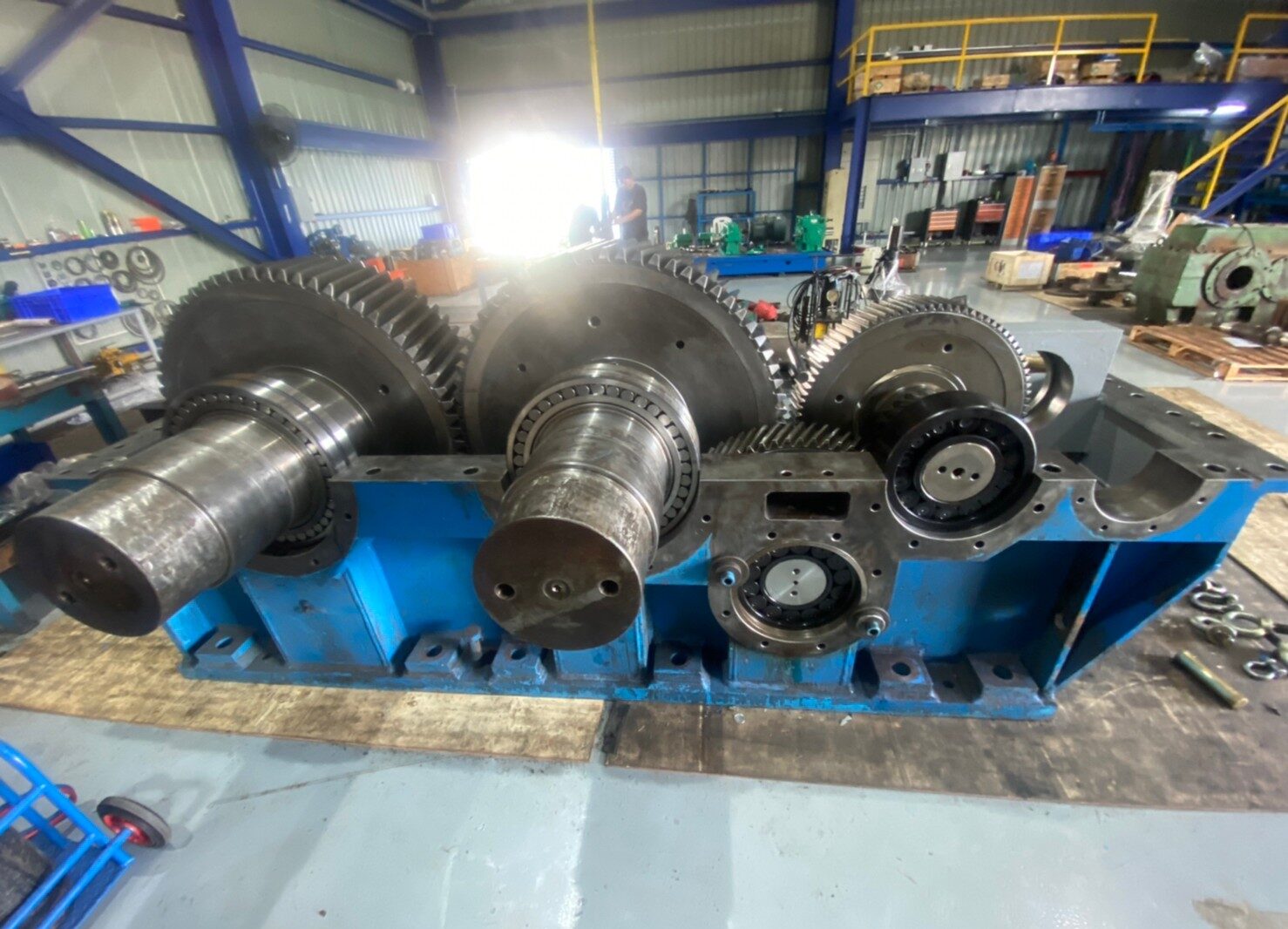 roller or plain; backstops; shaft locking devices; slew bearings, especially large ones, winches and planetary drives (driven by hydraulic or electrical motors), brakes, clutches and friction discs, fabricated parts such as gearbox casings, power transmissions and conveyor chains, screw shafts and worm screw jacks